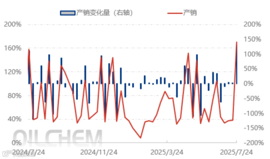 7月上旬涤纶长丝产销多维持3-5成,企业让利出货收效甚微,库存持续增长,随着生产企业现金流不断压缩,厂商低价惜售,报价相对坚挺,下游用户多于7月22日-23日集中补仓,涤纶长丝产销放量,7月22日单日平均产销率近600%,个别较高产销率1500%以上,7月23日仍有部分用户小量补仓,日均产销率做平以上,上周两次放量销售,使得涤纶长丝厂商库存大幅下降。