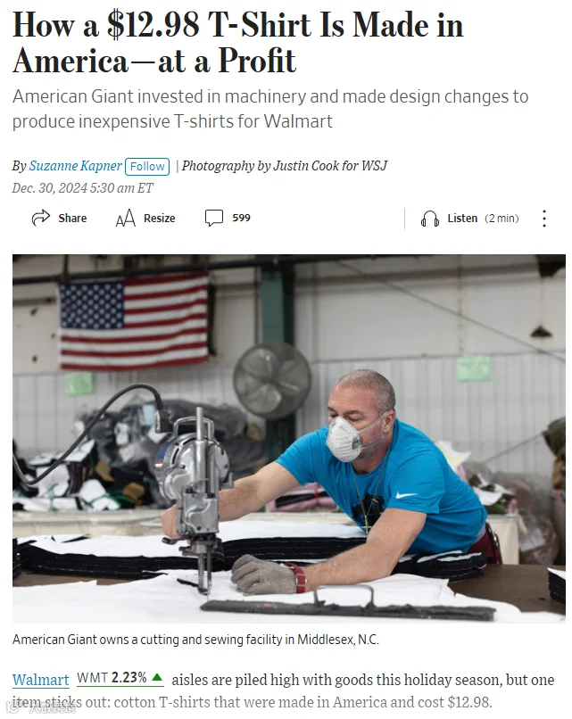 近日,有报道称,美国制造业实现重大突破,推出首件纯国产化T恤,所有环节均在美国完成,实现供应链自主可控,售价12.98美元,向沃尔玛供货。