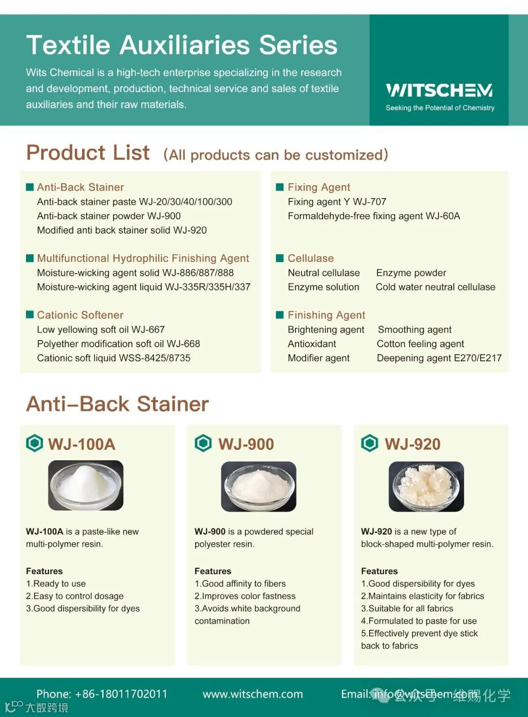 Pre-treatment Auxiliaries, Dyeing Auxiliaries, Finishing Agents, Printing Auxiliaries, Pigment Auxiliaries, Bio-enzymes, etc.