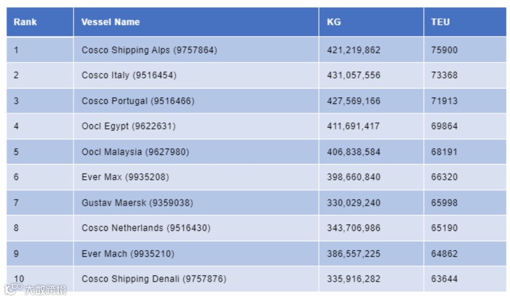 2024年度在美国港口卸货量最多的十大集装箱船名如下: