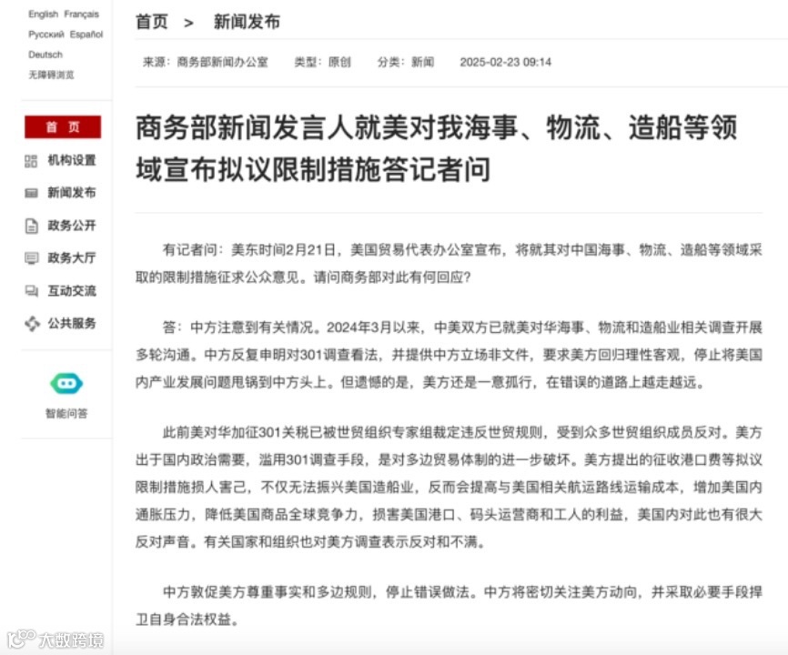 商务部新闻发言人对此回应称:中方注意到有关情况。2024年3月以来,中美双方已就美对华海事、物流和造船业相关调查开展多轮沟通。中方反复申明对301调查看法,并提供中方立场非文件,要求美方回归理性客观,停止将美国内产业发展问题甩锅到中方头上。但遗憾的是,美方还是一意孤行,在错误的道路上越走越远。
