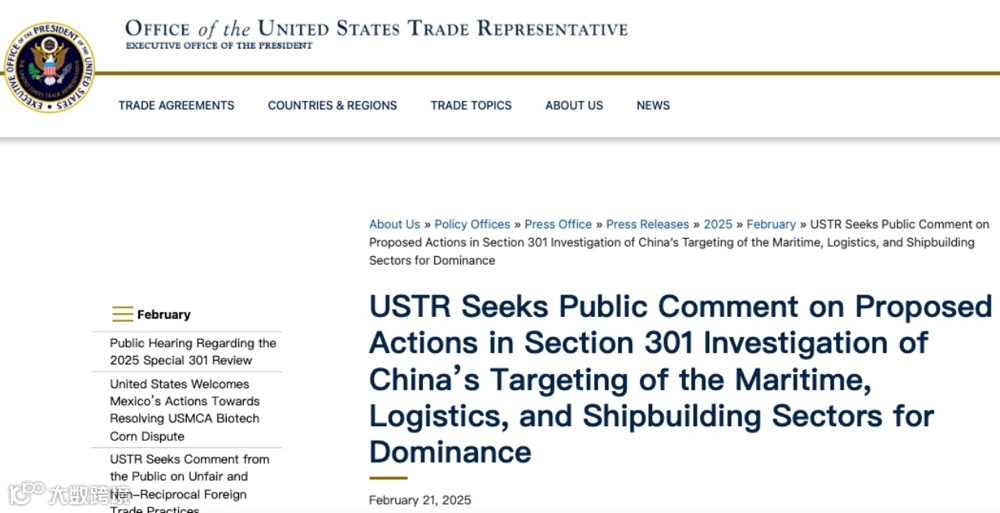 美东时间2月21日,美国贸易代表办公室(USTR)发布公告,就拟议的 301 条款征求公众意见。此举旨在打击中国在海事、物流和造船业日益增长的主导地位,措施包括征收关税和其他限制。