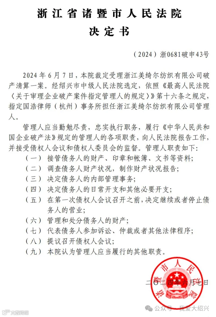 绍兴知名纺织公司破产清算