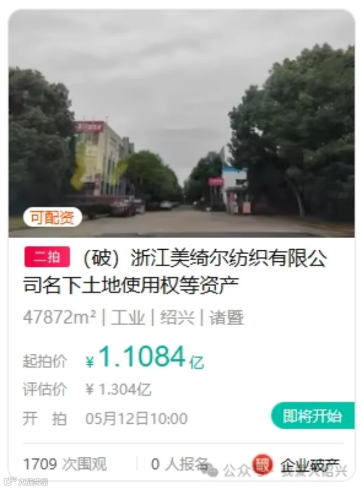 消息传来!绍兴知名纺织企业浙江美绮尔纺织有限公司名下土地使用权等资产即将公开拍卖!起拍价1.1亿元,光是参与拍卖就需要缴纳一千万元保证金!