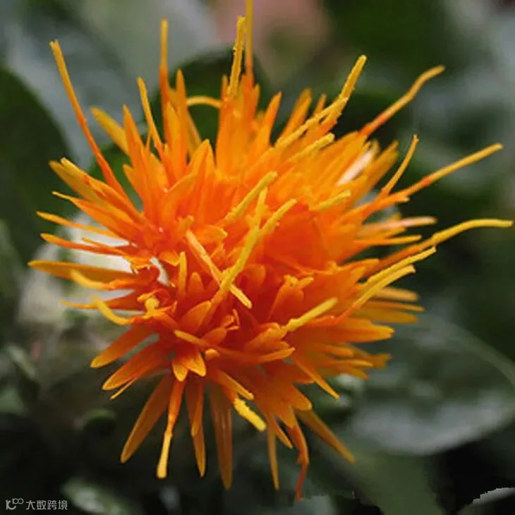 红花又名红蓝花,是夏天开红黄色小花的草本植物,原产于西北地区。西汉时,开始传到内地。红花适用于多种纤维的直接染色,是红色植物染料中色光最为鲜明的一种。用它染的红色称为真红或猩红,唐代诗中所作“红花颜色掩千花,任是猩猩血未加”诗句,形象地概括了红花色彩。