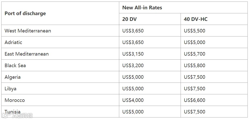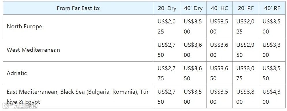 MSC宣布亚洲至地中海航线最新运价。世界上最大的海运公司MSC宣布了以下亚洲至地中海的新运费(FAK)费率。从2024年11月15日起生效,从所有亚洲港口(包括日本、韩国和东南亚)到欧洲的新费率将如下: