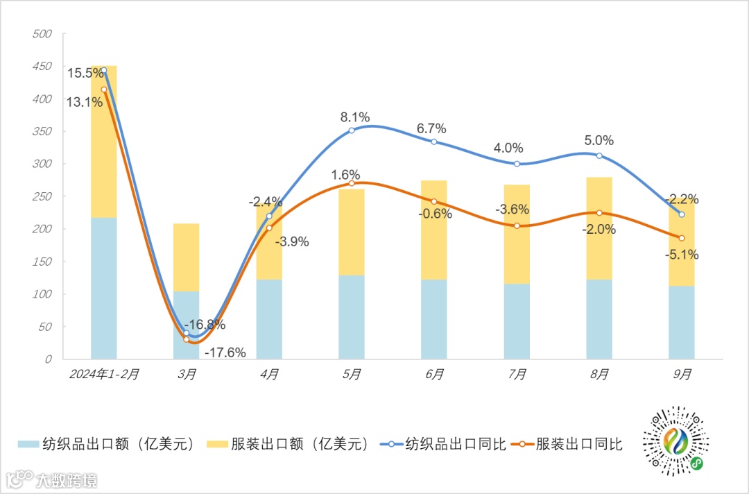 今年前三季度,我国纺织行业外贸形势逐季好转,三季度全国纺织品服装出口额分别较二季度和一季度增长2.5%和20.2%。但受去年同期基数较高影响,9月当月,我国纺织品服装出口额247.8亿美元,同比下降3.8%(以人民币计同比减少4.6%)。其中,纺织品出口112.5亿美元,同比下降2.2%(以人民币计同比减少3%);服装出口135.3亿美元,同比下降5.1%(以人民币计同比减少5.9%)。