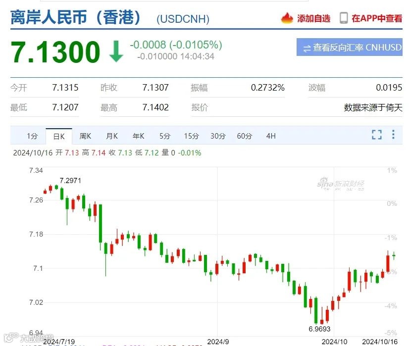 10月15日,在岸人民币对美元失守7.12关口,日内跌超400个基点;离岸人民币对美元汇率跌破7.13关口,日内跌超300个基点。