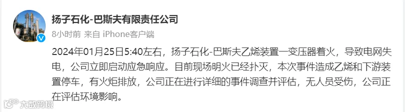 2024年01月25日5:40左右,扬子石化-巴斯夫乙烯装置一变压器着火,导致电网失电,公司立即启动应急响应。目前现场明火已经扑灭,本次事件造成乙烯和下游装置停车,有火炬排放,公司正在进行详细的事件调查并评估,无人员受伤,公司正在评估环境影响。