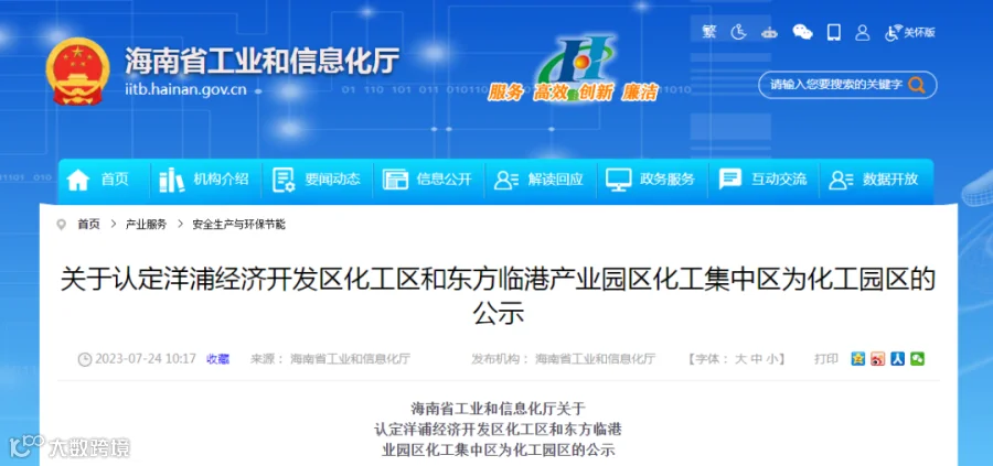 7月24日,海南省工业和信息化厅发布了《关于认定洋浦经济开发区化工区和东方临港产业园区化工集中区为化工园区的公示》。该公示指出了为进一步规范海南省化工园区建设,提升园区安全发展和绿色发展水平,促进海南省化工产业尤其是石化产业高质量发展的目标。