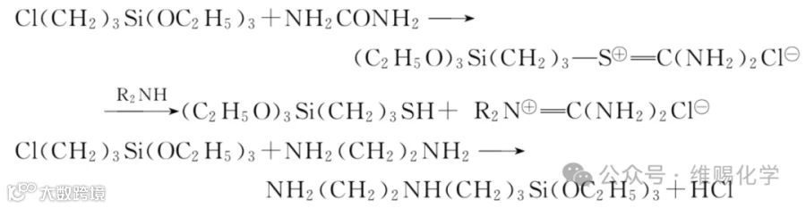 例如,γ-氯丙基三乙氧基硅烷可以通过与硫脲反应进一步合成γ-巯丙基三乙氧基硅烷。同样,γ-氯丙基三乙氧基硅烷与过量乙二胺反应,可以合成N-(β-氨乙基)-γ-氨丙基三乙氧基硅烷。