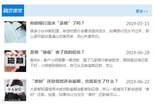 融资课堂模块,宣传金融相关知识,发布最新融资产品信息,让客户了解到金融知识,在融资上少走弯路。