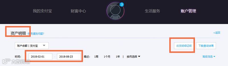 第三步,跳转到资产明细页面,选择所需要查询的日期,然后点击“收支明细证明”