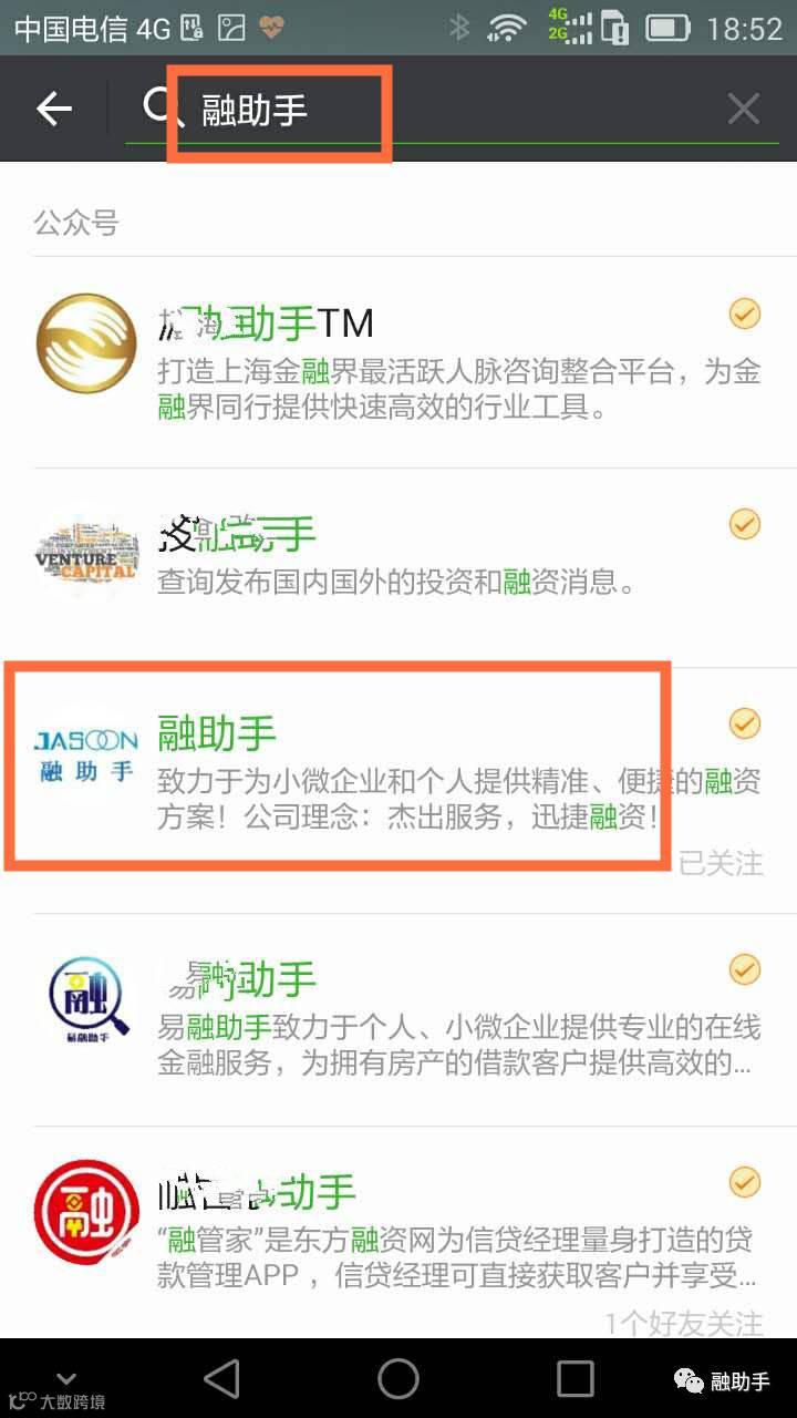 融助手第一步:在微信搜索公众号“融助手”,点击关注,进入“融助手”公众号