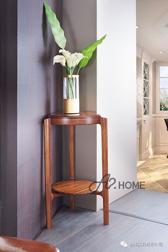 颜值和实用并存, 乌金木花架增加了空间的实用性。