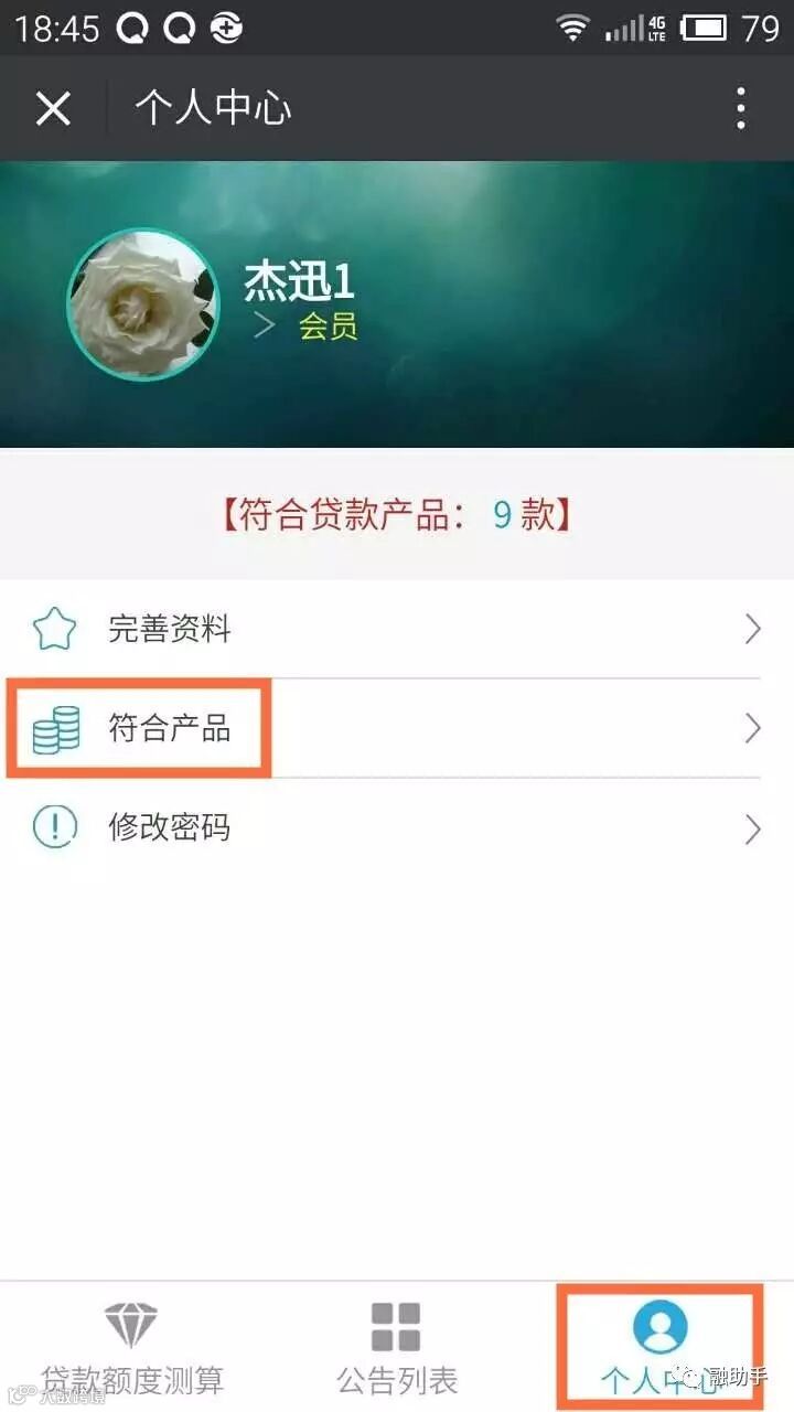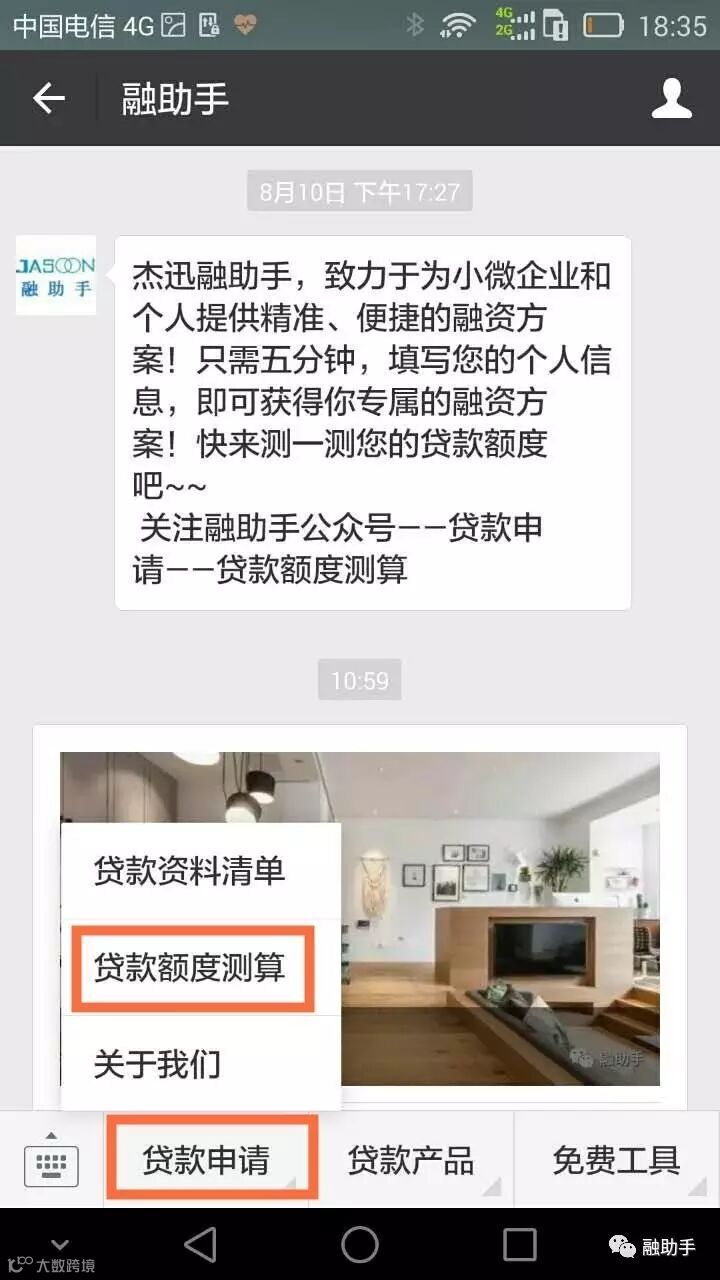 第一步,关注“融助手”微信公众号,点击“贷款申请”--再点击“贷款额度测算”,进入融助手额度测算系统