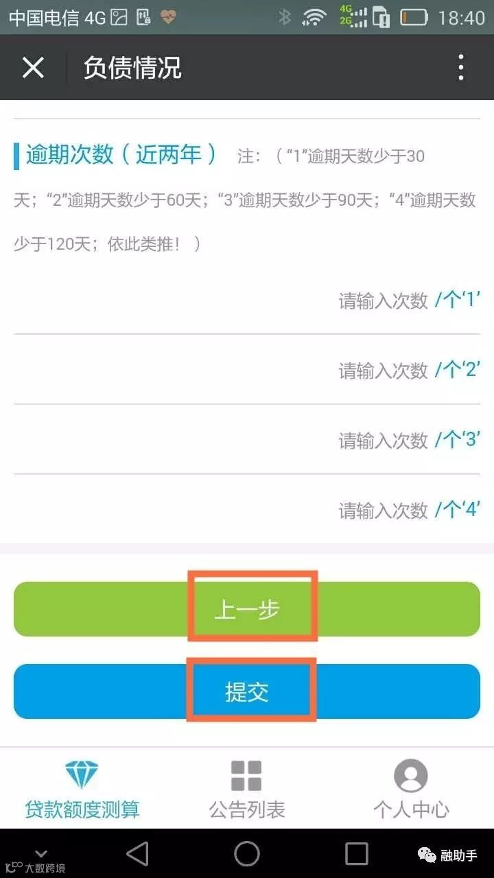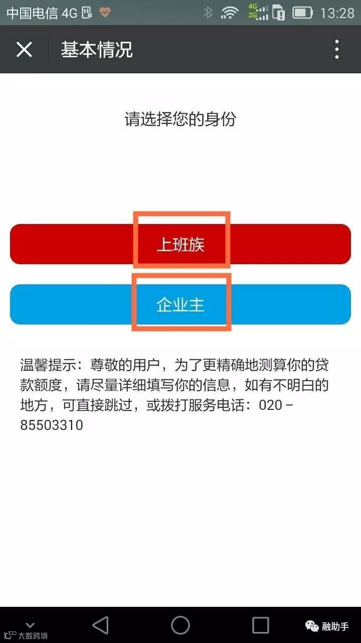 第四步:登录进入“融助手”系统后,选择身份“上班族”或“企业主”,按要求填写资料(注:为了提高方案准确率,尽量详细填写),点击“下一步”进入下一个填写页面,最后点击“提交”