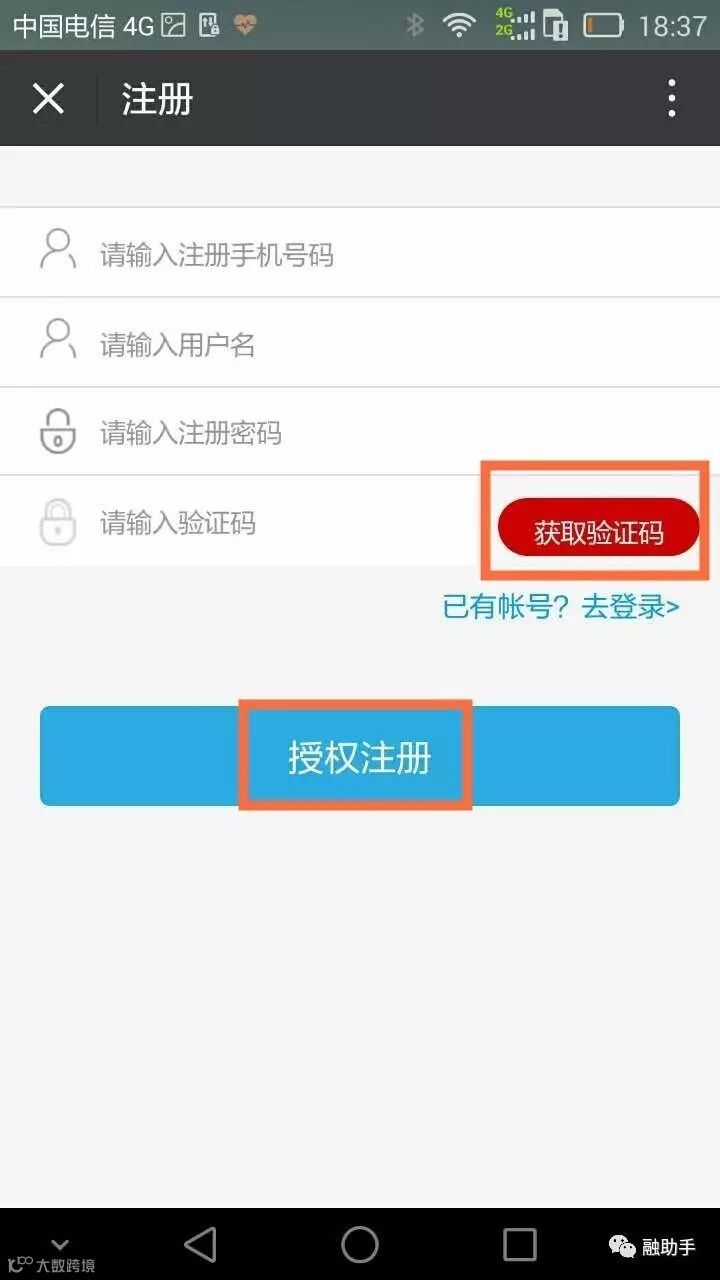 第三步:进入注册页面,输入“手机号码”、“用户名”、“密码”,然后点击“获取验证码”--手机收到验证码后输入--点击“授权注册”,进入下一步