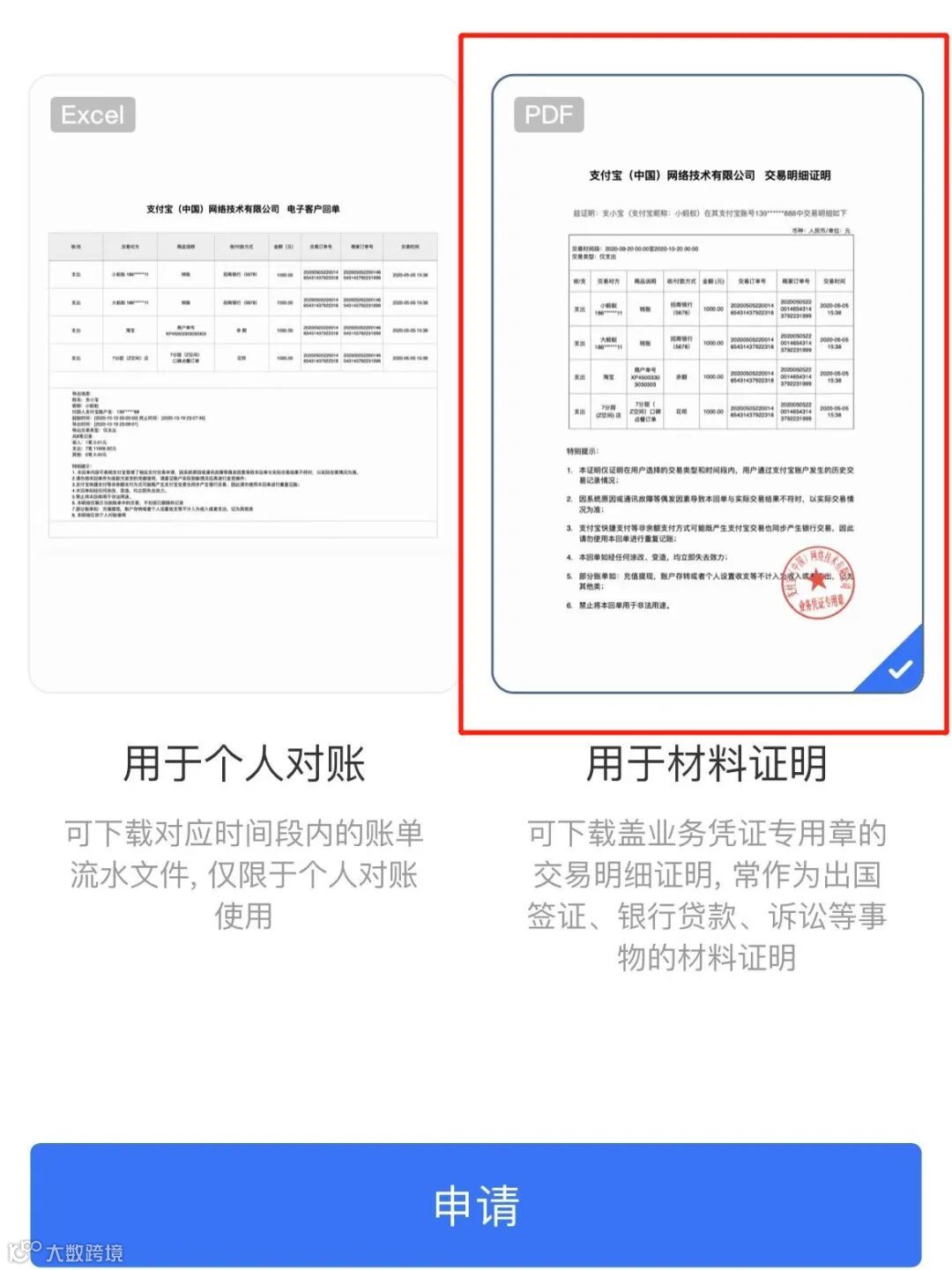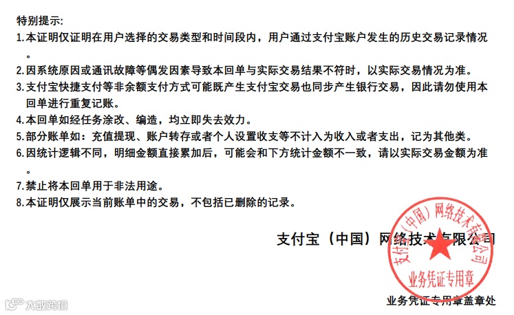 第六步,查看下载的电子版流水明细,结果如下图,带有支付宝公司公章,打印出来提交给银行即可