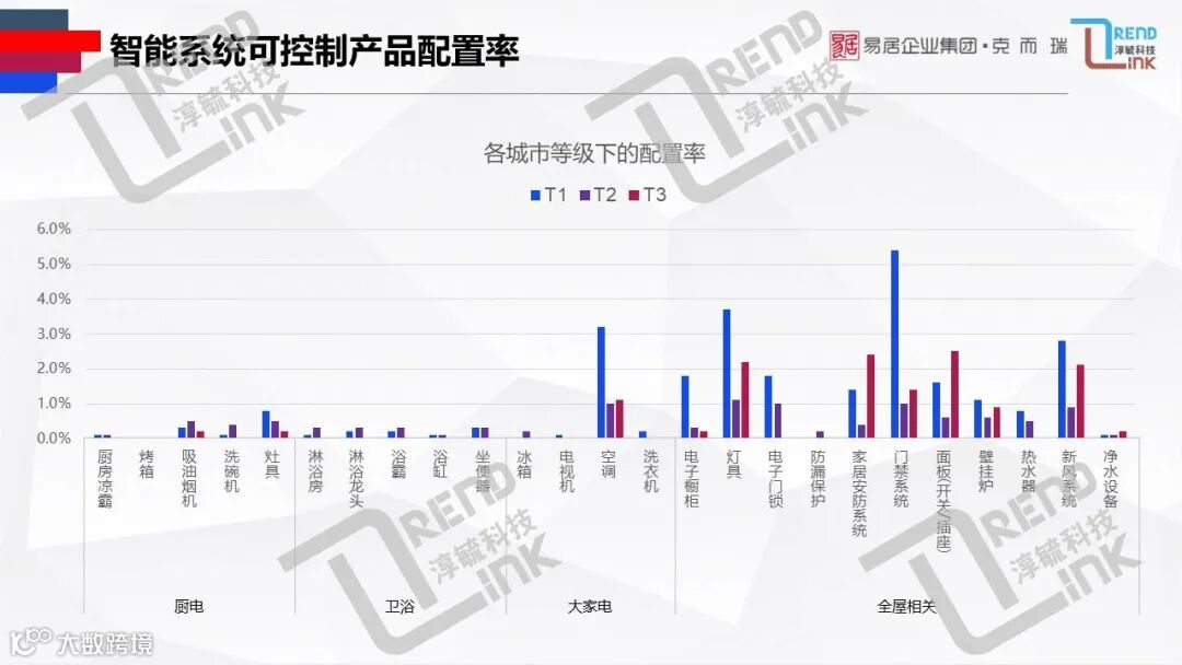 根据淳毓科技对智能产品在不同等级城市中的配置率报告来看,整体上,一线城市配置率明显高于其他等级城市,这是由于一线城市最早推行装修政策且经济规模较大,精装修渗透率高,因此常见的智能家居产品如空调、电子橱柜、门禁系统、新风系统等配置率远远大于其他等级城市。