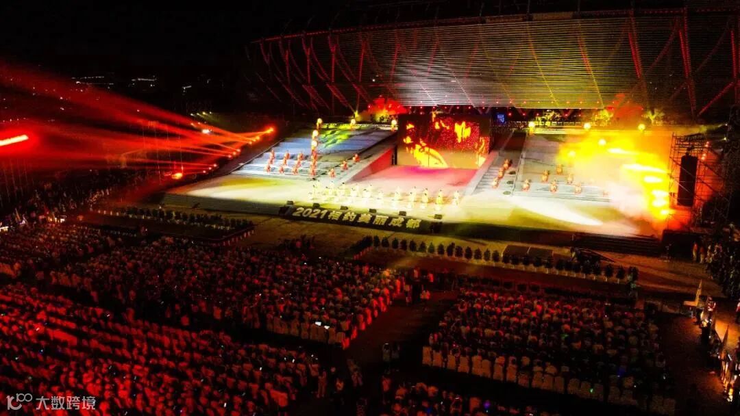 晚会以灯光秀“筑巢引凤”作为开场,刹那间吸引了所有人的眼球——绚丽的光影笼罩在东安湖体育公园主场馆上,成都大运会会徽变为凤凰神鸟,寄托着放飞梦想的希冀,以昂扬的姿态飞向天空,传递着成都这座城市作为大运会东道主的热情和活力。