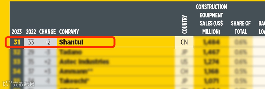 ▌近日,2023全球工程机械制造商50强排行榜(Yellow Table 2023)公布,山推再度上榜,位列第31位,较去年名次上升2位,成为唯一一家排名上升的中国工程机械品牌!