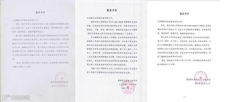 “我们对贵公司提供的VOLVO ABG 8820B沥青摊铺机品质给予高度认可!在贵公司采购的两台摊铺机,具有操作简易、稳定耐用、故障率低、摊铺质量好等优点。”