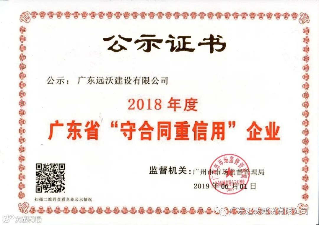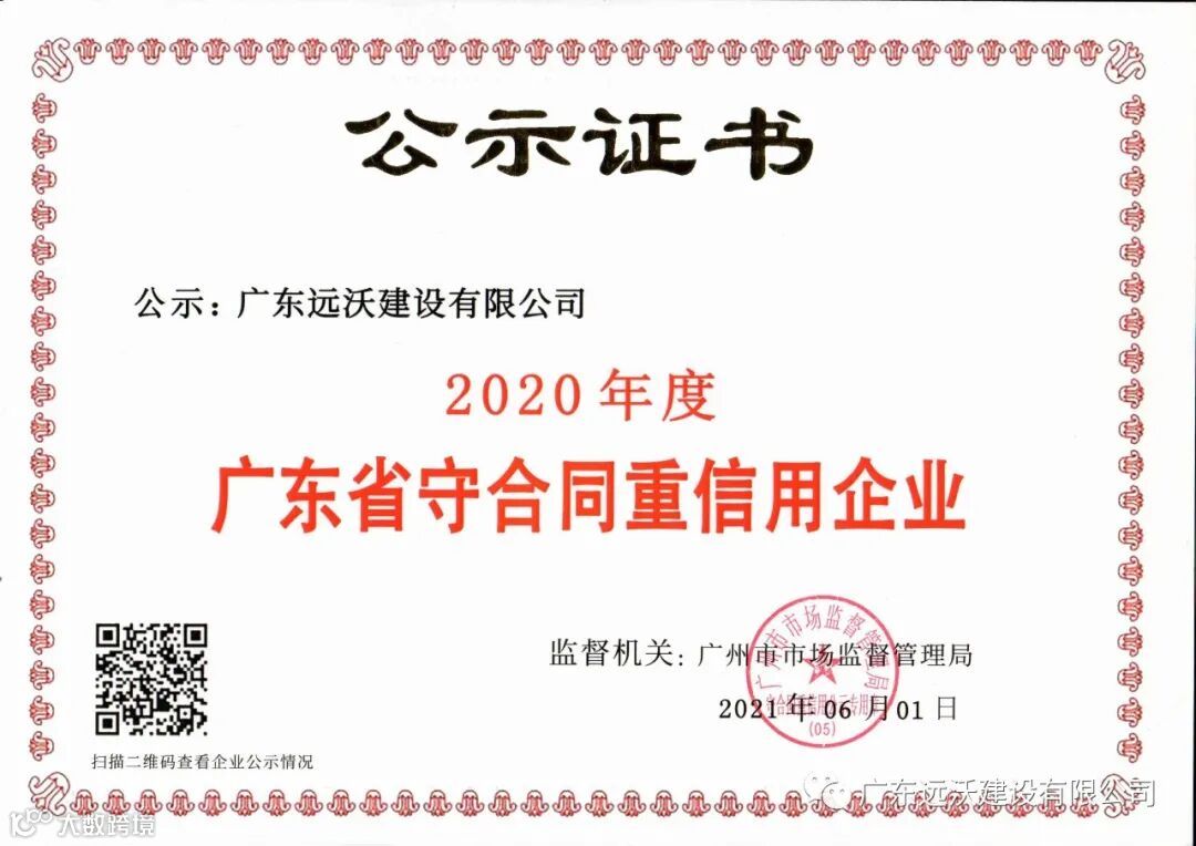 2020年度“广东省守合同重信用企业”名单正式公布,广东远沃建设有限公司再次上榜,这是公司连续三年(2018—2020)荣获“广东省守合同重信用荣誉称号。