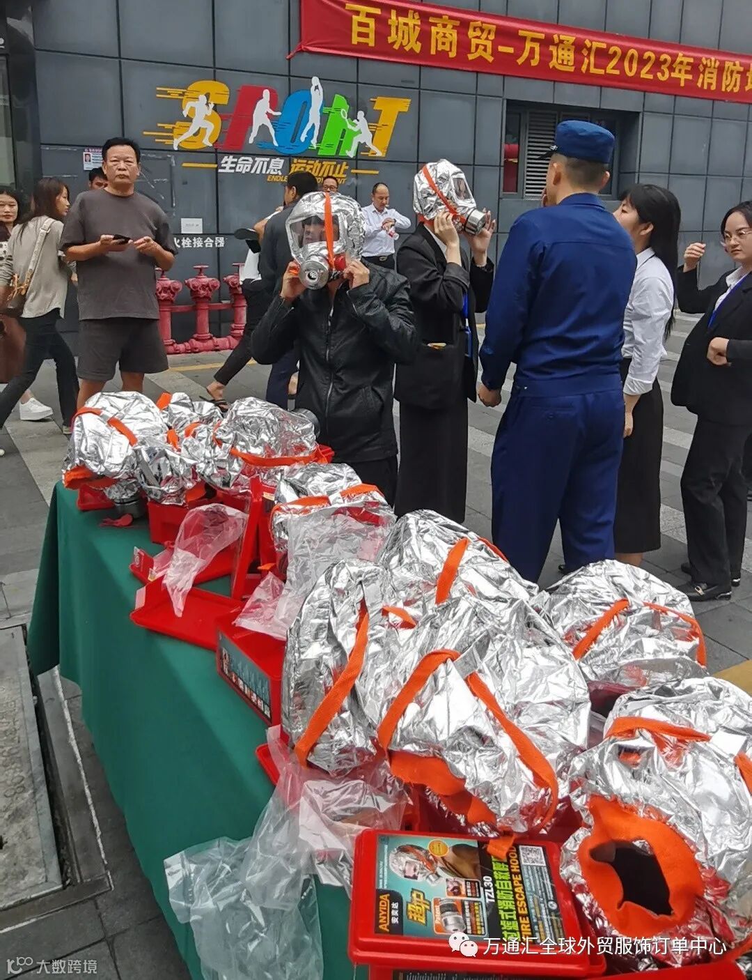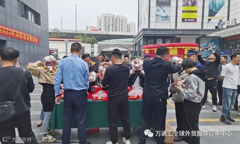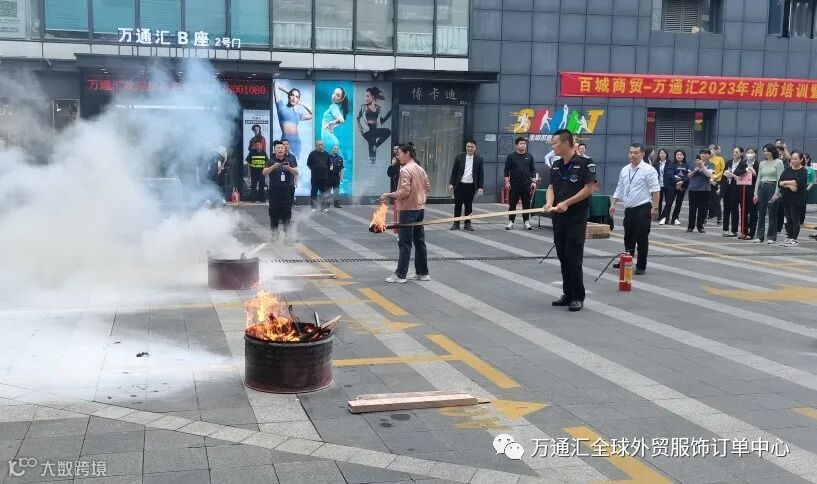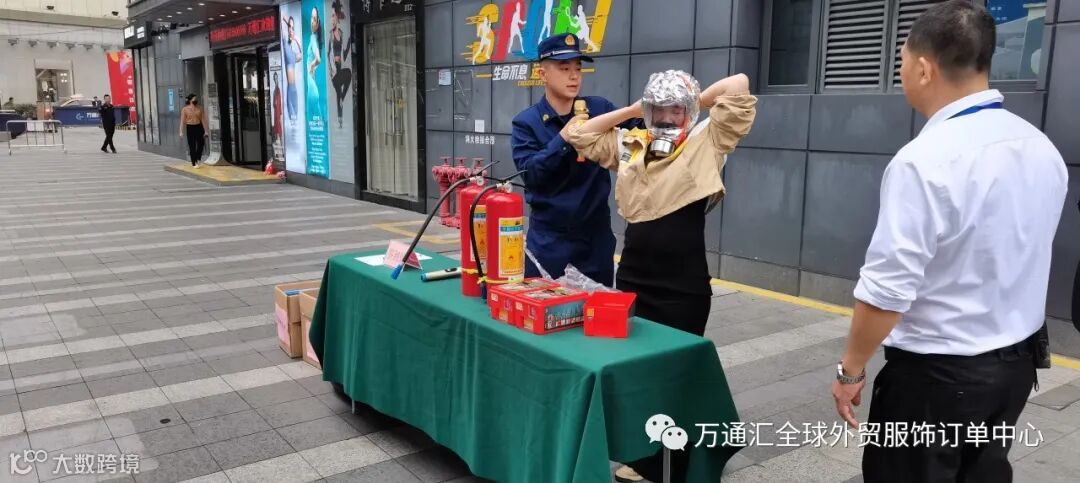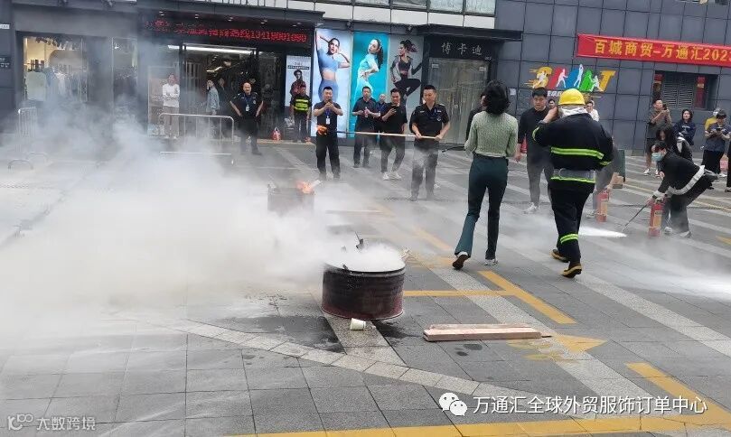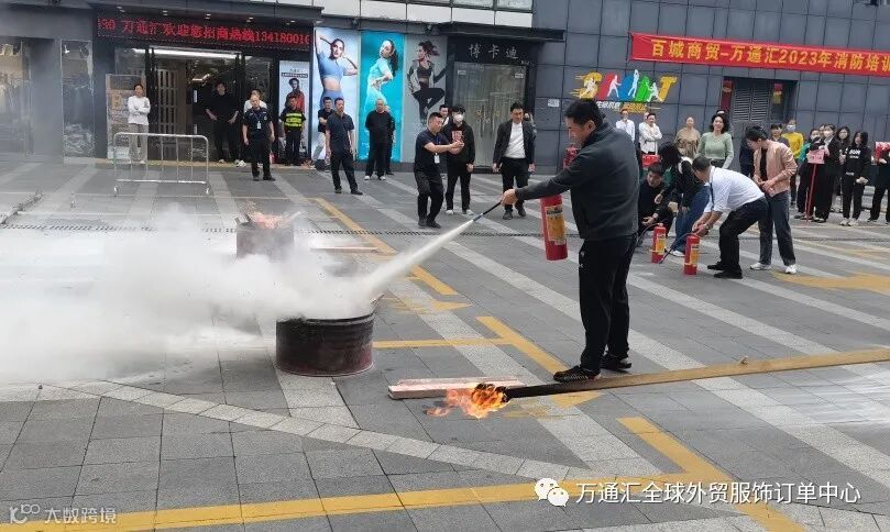 商场商户体验灭火器的使用并在现场使用灭火器进行灭火,以及消防面具的使用佩戴。