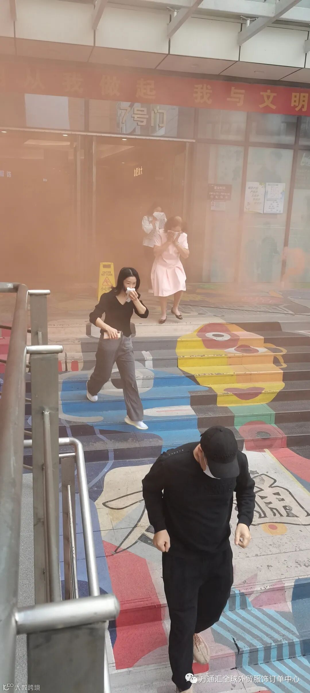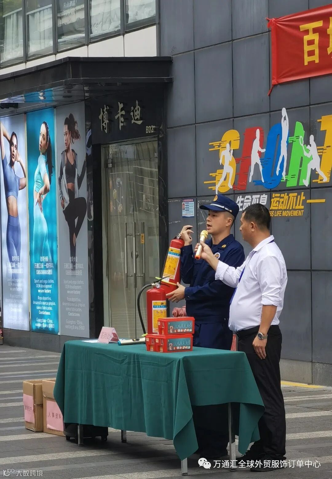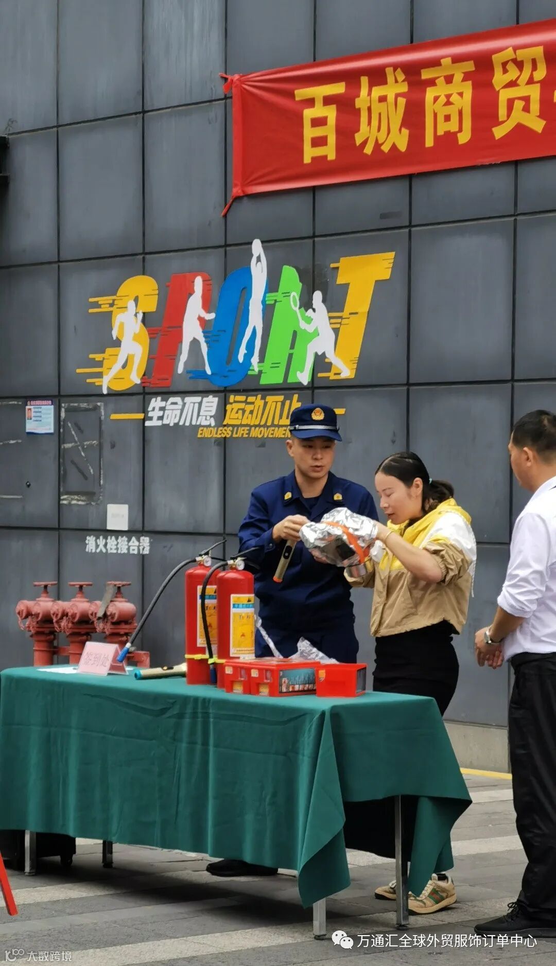 商场商户体验灭火器的使用并在现场使用灭火器进行灭火,以及消防面具的使用佩戴。