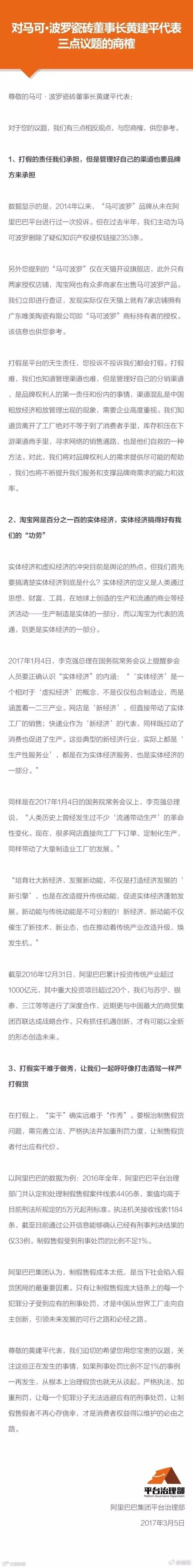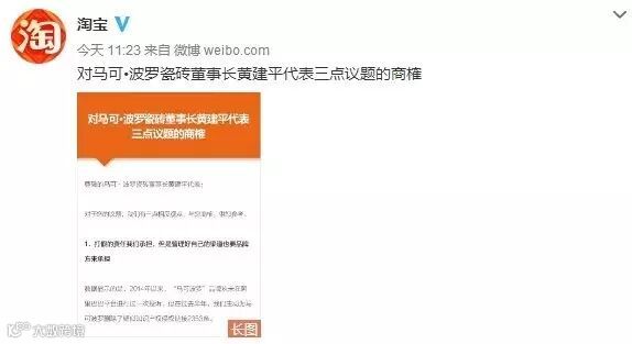 对于上述观点,淘宝于今天中午在官方微博发布《对马可•波罗瓷砖董事长黄建平代表三点议题的商榷 》一文进行回应。