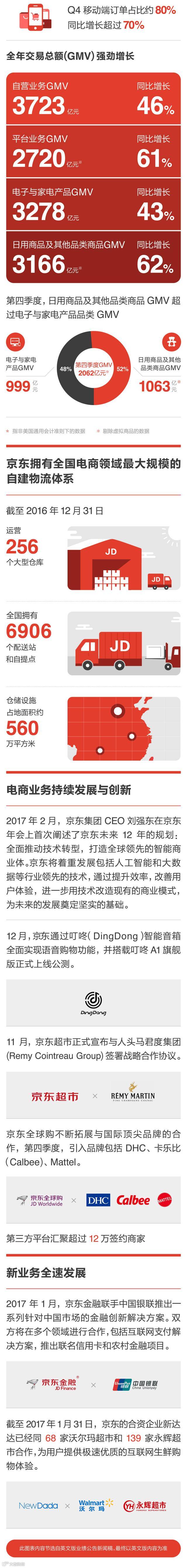 财年内,京东继续保持强劲的增长态势。2016年京东全年交易总额(GMV)同比增长47%,达到6582亿元人民币(若遵循行业口径统计方式,2016年交易总额已高达9392亿元人民币);2016全年净收入为2602亿元人民币,同比增长44%。第四季度,得益于“双11”和“双12”的卓越表现,单季净收入达到了803亿元人民币,同比增长47%,远超华尔街预期。