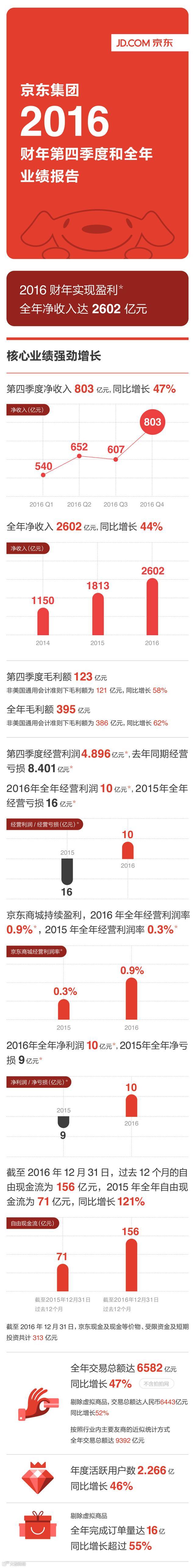 2017年3月2日晚,京东集团(纳斯达克股票代码:JD)发布了2016年第四季度及全年业绩。京东继续保持大幅领先于行业的高质量增长态势,全年净收入高达2602亿元,同比增长44%,并实现年度扭亏为盈,非美国通用会计准则下(Non-GAAP)年度净利润达10亿元人民币。