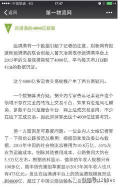 第一物流网也对运满满公布的交易规模突破4000亿提出了质疑,而运满满公司并未对此做任何回应。稍微动脑子算一下,就会觉得运满满太把读者当傻子了。