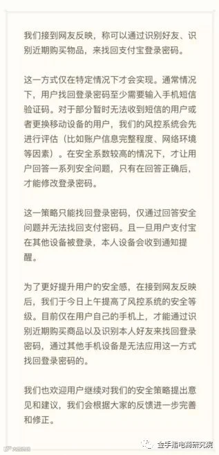 随后支付宝转发,并配文称,“在接到网友反映后,今日上午进一步提高了风控系统的安全等级。目前仅在用户自己的手机上,才能通过识别近期购买商品以及识别本人好友来找回登录密码,通过其他手机设备是无法应用这一方式找回登录密码的。”