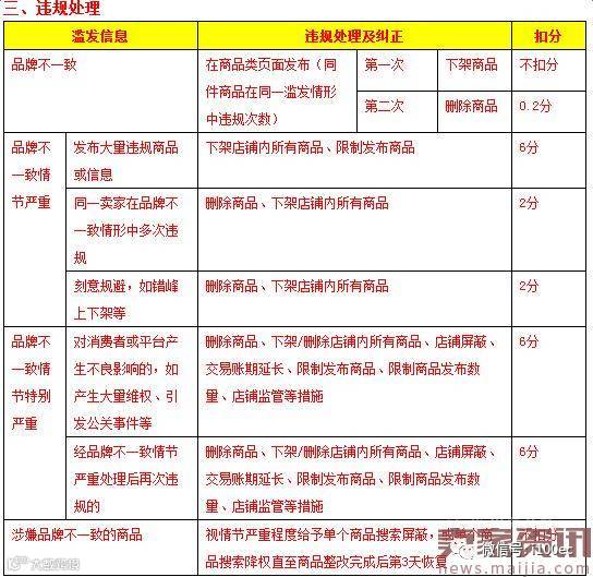 新增的《品牌不一致的认定和处罚的规则与实施细则》,不仅明确了品牌不一致的定义、情形,还给予了相应的违规处理办法。根据品牌不一致情节严重程度,卖家会受到不同程度的违规处理及纠正,包括删除商品、下架、删除店铺内所有商品、店铺屏蔽、交易账期延长、限制发布商品、限制扣分、商品发布数量、店铺监管等措施。
