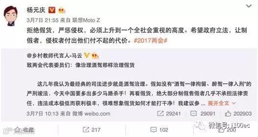 马云在微博表示,绝大部分制假售假者几乎不承担法律责任,违法成本极低而获利极丰,很难想象假货如何才能打干净!建议参考酒驾醉驾治理,设想假如销 售一件假货拘留七天,制造一件假货入刑,那么今天中国的知识产权保护现状、食品药品安全现状,我们国家未来的创新能力一定会发生天翻地覆的变化。