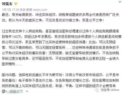 获悉,刘强东微博发文称,最近,有关电商假货、冲击实体经济、纳税等话题被许多两会代表委员所广泛关注。我认为今天的虚实之争,不应该是优劣对错之争,而是公平之争!可以无 照经营、可以不缴纳税收、可以无固定经营场所……这些特殊待遇背后就是竞争的不公平和对实体经济的事实伤害!