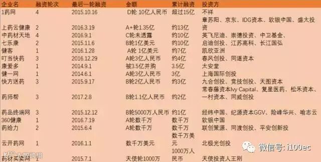 统观所有融资信息,有两个较为明显的特点,一是融资轮次都集中在A轮之后,计入我们统计的15笔创业公司融资事件当中,有13家是A轮或者A轮之后,这表示医药电商已经进入成熟期,市场已经沉淀下来,新入场的企业已经不多;二是单笔额度较大,1亿人民币及以上的融资事件有9起。