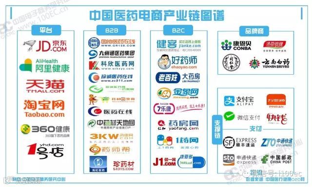 据中国医药电商网(www.100ec.cn/zt/yy/)企业数据库监测显示,近年来“互联网”概念辐射并渗透医药行业,医药电商持续快速发展,传统购药模式正在被改变,产业转型正当其时,发展潜力巨大。目前医药电商包括三大类:(1)垂直电商:健一网、九州通、老百姓、珍诚医药、药药好、丁香园、叮当快药、快方送药、药给力、好药师、七乐康、健客网;(2)综合平台型:淘宝、天猫、京东、1号店;(3)品牌商:云南白药、汤臣倍健、同仁堂、碧生源、贝因美、康恩贝等。