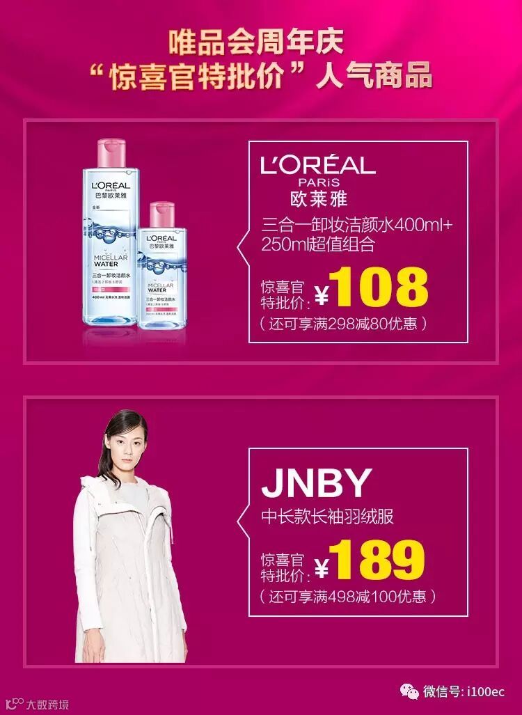 唯品会周年庆中最受追捧的是10万款标有“惊喜官特批价”的商品,开售后,“惊喜官特批价”中的“欧莱雅三合一卸妆洁颜水400ml+250ml超值组合”即售出1080件,“JNBY中长款长袖羽绒服”售出543件,“水星家纺1.8m床欧式大提花六件套-梦莎雅颂”售出1890件,“爱慕花样年华3/4中厚超柔软模杯文胸”售出2364件,成为“销量之最”;此外,“惊喜官特批价”中的数码家居类商品也十分受欢迎,JBL无线蓝牙便携式户外音箱、苏泊尔球釜智能系列电饭煲4L、小狗PUPPY吸尘器等成为该类别的畅销商品。