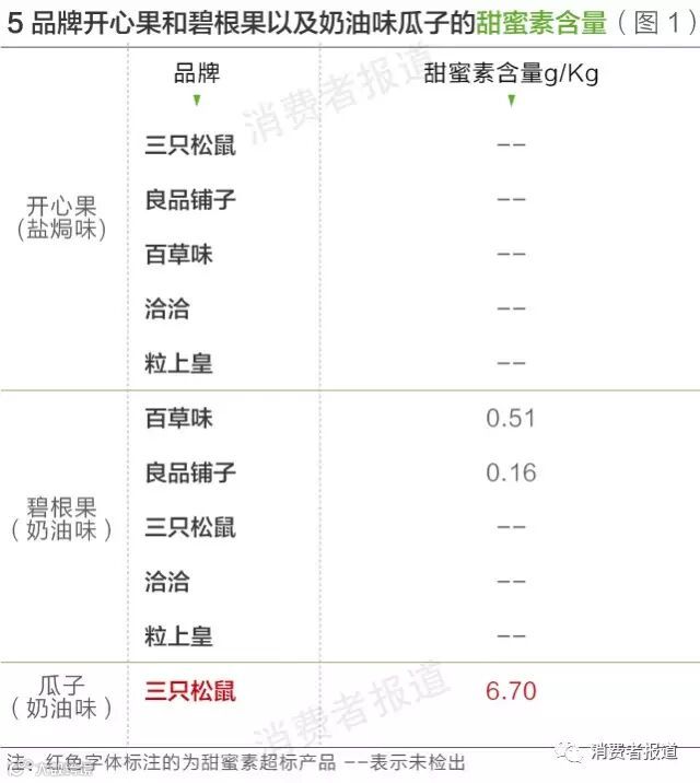 另外,在《消费者报道》此次送检的15款坚果产品中,开心果均为盐焗味,碧根果为奶油味,瓜子中三只松鼠的产品为奶油味,其他4款则为原味,因此《消费者报道》对三只松鼠瓜子也检测了甜蜜素含量。