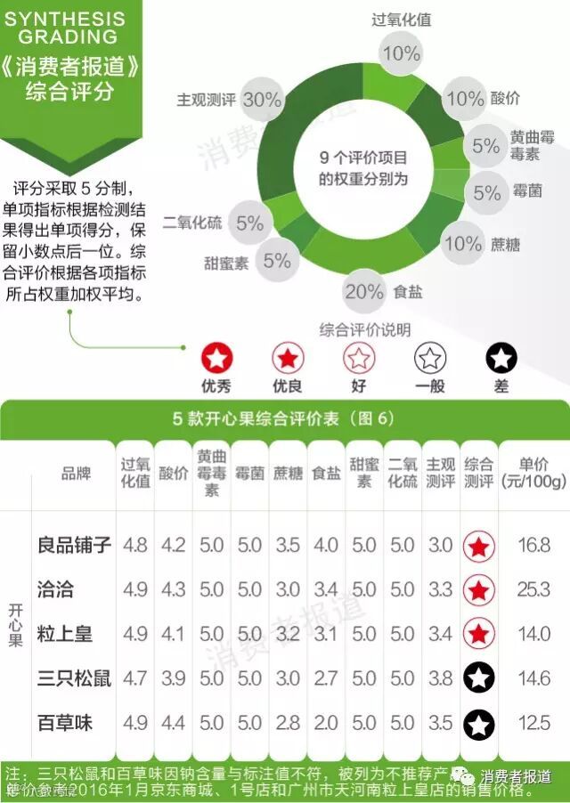 2016年1月,《消费者报道》也曾选择了目前市场上知名度较高的良品铺子、洽洽、百草味、粒上皇、三只松鼠等5品牌开心果、碧根果和瓜子(葵花籽),在第三方权威检测机构实验室进行了对比检测。
