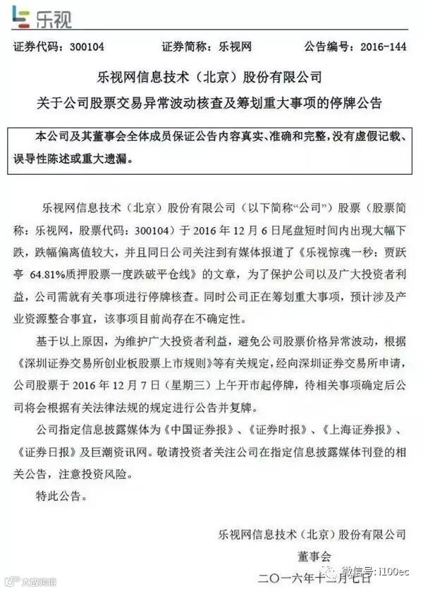 晚间,乐视网再发公告称,公司将对媒体所报道的“跌破平仓线”有关事项进行停牌核查。