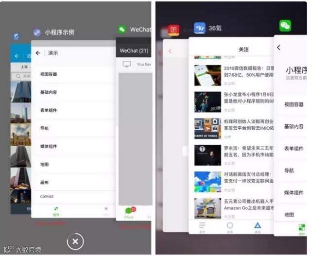 在安卓系统上,小程序,真的像是一个小小的程序一样在运行。这意味着,它就像在运行两个程序一样(具体看下面的截图),你可以先行离开这个页面,去聊聊天,再回来操作或者阅读;而不需要像一样,多次点击,再回到微信公号的某个页面中。
