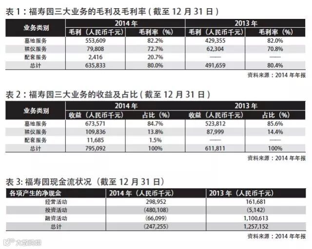 2015年清明前夕,福寿园发布了2014年的财报。财报显示,2014年福寿园的营业收入为7.951亿元(除非特别标注,以下币种皆为人民币)较2013年增长30%,净利润为2.851亿元,较2013年上升了50%。其中, 连续两年整体的毛利率高达80%,净利润率为38.5%(见表1)。