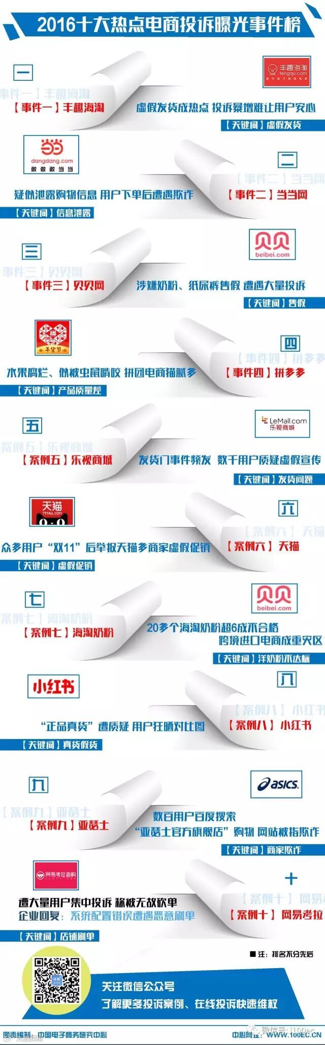 2016年,电商发展迅速的同时也暴露了一系列问题,据国内知名第三方电商维权平台“中国电子商务投诉与维权公共服务平台”(http://www.100ec.cn/zt/315/)积累的大数据以及媒体舆情监测统计显示,丰趣海淘虚假发货、当当网信息泄露、贝贝网涉嫌售假、拼多多“猫腻”等入选“2016十大热点电商投诉曝光事件榜”,榜单将入选2017年3.15前发布的《2016年度中国电子商务用户体验与投诉监测报告》。