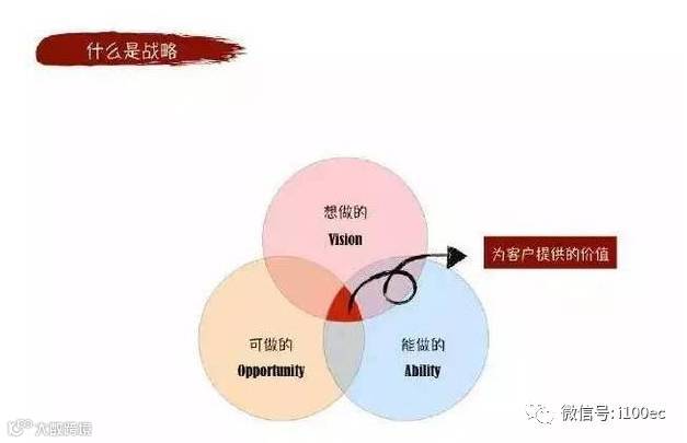什么东西你能做?无论是资源、人还是组织建设的能力。哪些东西是你能做的?中间的小小交集就是你该做的,想做、可做、能做,这三个条件都符合,才是真正该做的,这就是你的战略。