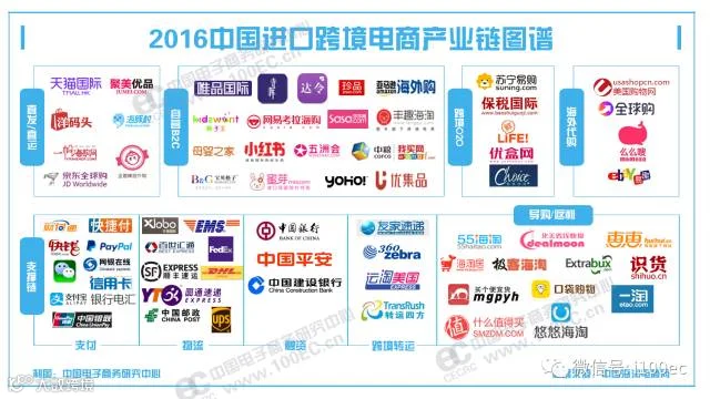 据中国电子商务研究中心(微信公众号:i100ec)发布的《中国进口跨境电商产业链图谱》显示,目前进口跨境电商电商模式有五大类:1)直发/直运型(天猫国际、京东全球购、洋码头、聚美优品);2)自营B2C型(亚马逊海外购、丰趣海淘、蜜芽、唯品国际、网易考拉海购、小红书);3)导购/返利型(55海淘、什么值得买);4)跨境O2O型(苏宁、保税国际、优盒网等);5)海外代购型(淘宝全球购、美国购物网)。