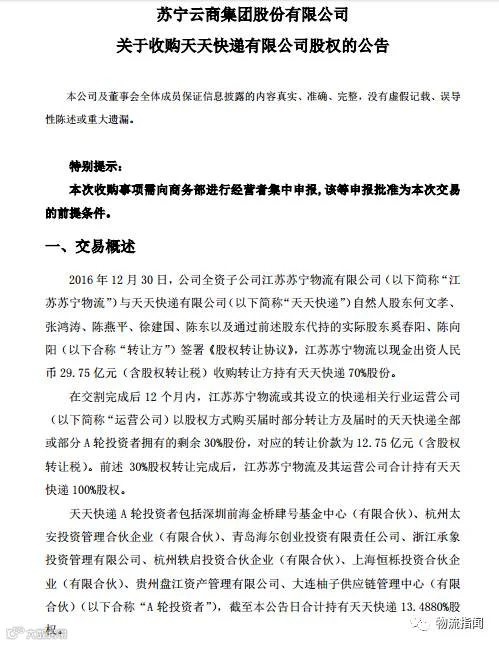 日前苏宁云商旗下子公司江苏苏宁物流有限公司宣布收购估值42.5亿的天天快递全部股份。公告显示:此次收购分两次完成,2016年12月30日,苏宁以现金出资人民币29.75亿元收购天天快递70%股份;剩余的30%的股份作价12.75亿元,将在交割完成后12个月内完成。本次交易标的天天快递100%股权估值为42.5亿元。天天快递2016年预测税后净利润不低于8400万元。